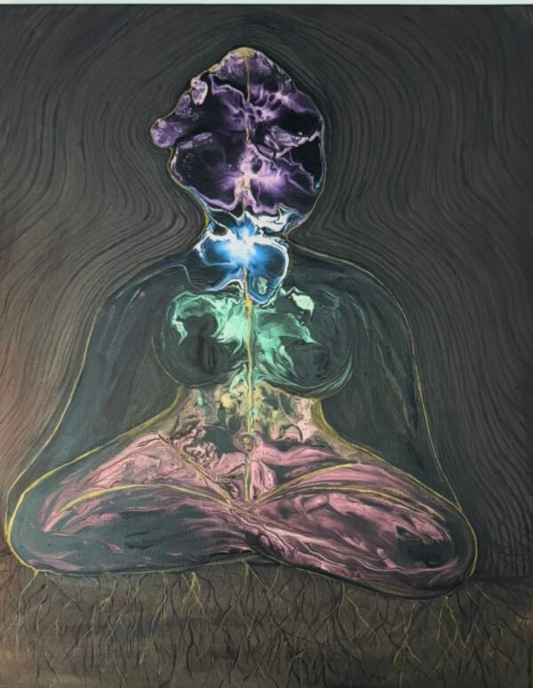 Meditation—in all its forms—becomes the gateway to this state. Whether through stillness, breath, movement, or intentional awareness, we return to ourselves and allow the energy to reorganize. Transformation doesn’t come from force, but from attunement. The figure sits in deep stillness, yet radiates with movement—light pulses through the spine, from the earth to the cosmos. This is the sacred work of being: to soften, to align, and to allow energy to rise.