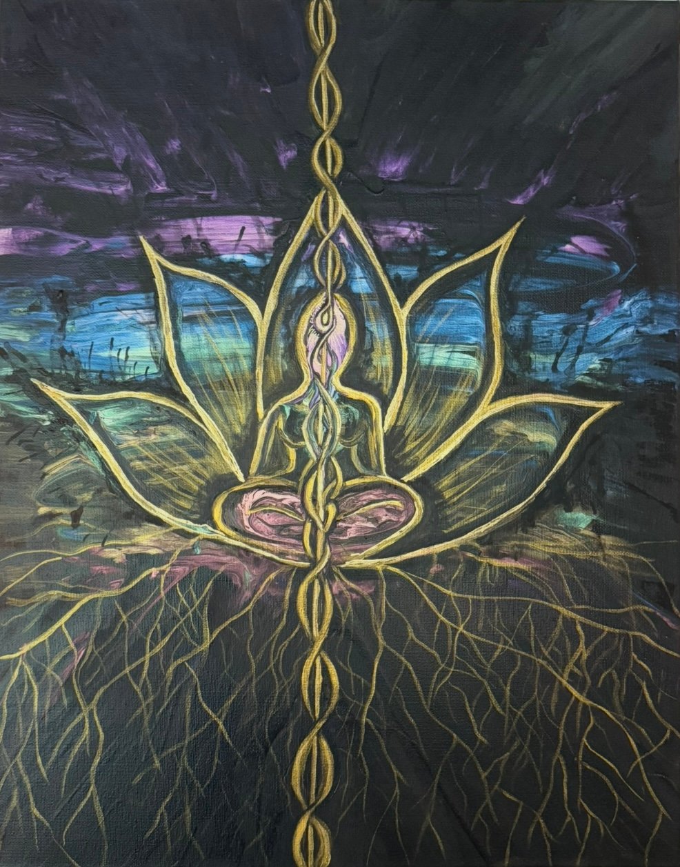 “Where Roots Become Sky” honors the transformational power of self-knowing. As we turn inward, meet our inner terrain, and allow energy to rise, we become the bridge—between matter and light, between the seen and the unseen. This is not a reaching upward, but a remembering inward.